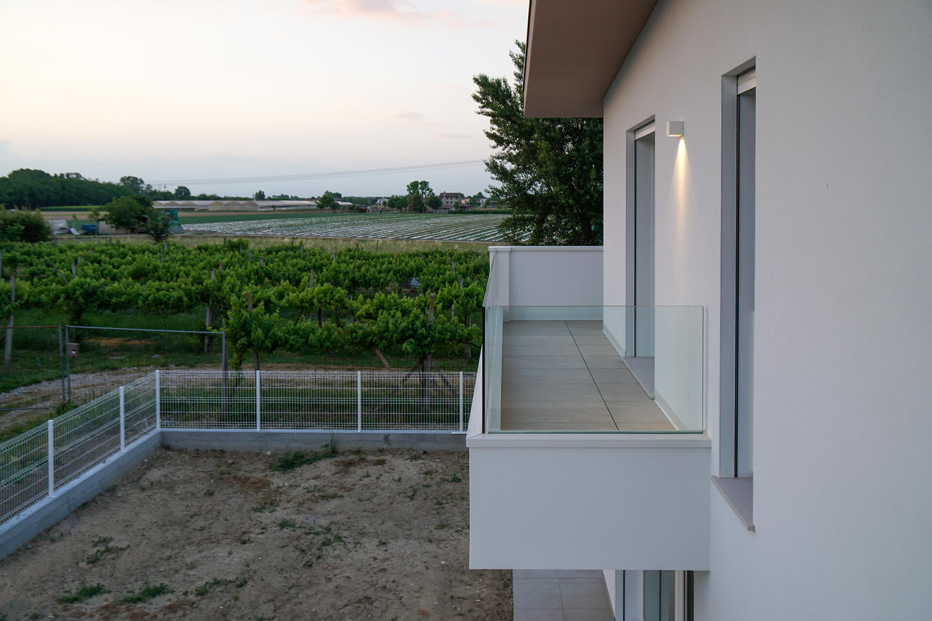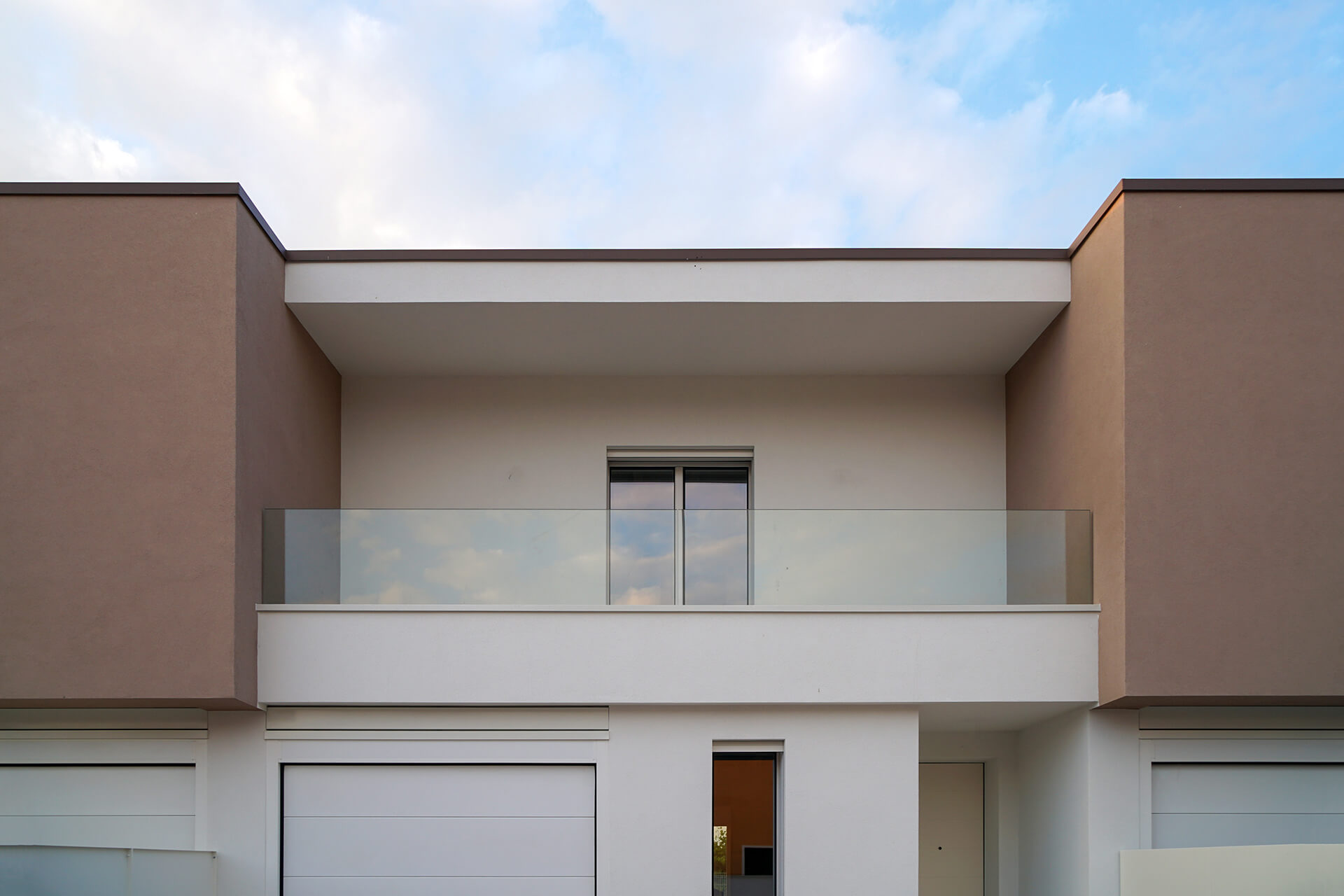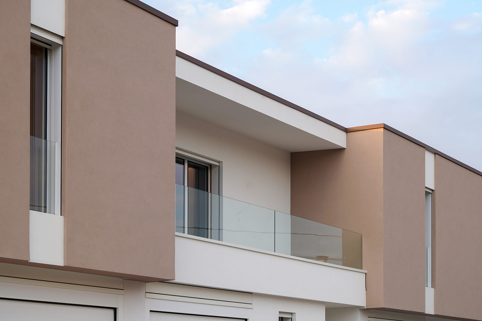 Le due porzioni di testa sono caratterizzate da un volume emergente al piano primo, che protegge il piano terra e crea un affaccio principale alle due unità rispettivamente verso est e verso ovest. La porzione centrale si sviluppa invece lungo la direttrice nord-sud con la zona notte provvista di ampio terrazzo.